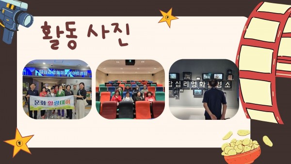 [서울시동대문구재가노인복지기관] 5월 문화체험활동 '영화관람' 페이지 정보 작성자 은천노인복지회 작성일25-06-11 14:39 조회3,637회 댓글0건 관련링크 이전글 다음글 목록 답변 본문 촬영소 사거리에 위치한 '답십리영화미디어아트센터'에서 영화 관람을 진행하였습니다! 이전글 다음글 목록 답변