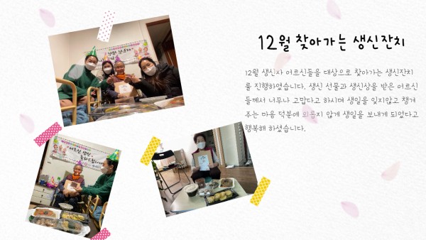 [재가노인지원서비스 ] 12월 찾아가는 생신잔치 페이지 정보 작성자 은천노인복지회 작성일21-12-31 13:32 조회20,580회 댓글0건 관련링크 이전글 다음글 목록 답변 본문 12월 찾아가는 생신잔치 이전글 다음글 목록 답변