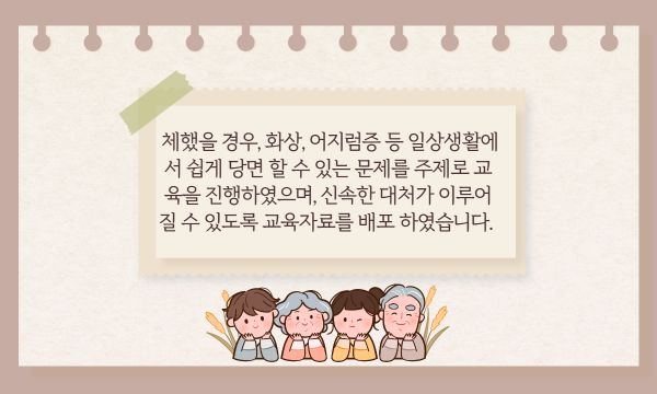 [재가노인서비스] 대상자교육_응급처치교육 페이지 정보 작성자 은천노인복지회 작성일22-03-03 11:43 조회19,743회 댓글0건 관련링크 이전글 다음글 목록 답변 본문 은천재가노인지원센터 대상자 어르신들에게 응급처치교육을 진행하였습니다. 이전글 다음글 목록 답변
