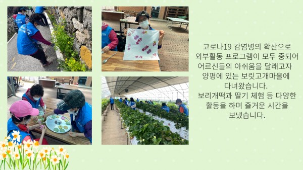 [재가노인지원] 봄 나들이 페이지 정보 작성자 은천노인복지회 작성일22-06-03 17:15 조회18,864회 댓글0건 관련링크 이전글 다음글 목록 답변 본문 재가노인지원센터 어르신들과 양평 보릿고개마을로 나들이를 다녀왔습니다. 이전글 다음글 목록 답변