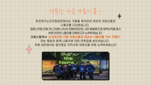 [재가노인지원서비스] 2021년 가을나들이 페이지 정보 작성자 은천노인복지회 작성일21-12-15 16:01 조회20,888회 댓글0건 관련링크 이전글 다음글 목록 답변 본문 2021년 재가노인지원서비스 대상 어르신 가을나들이 이전글 다음글 목록 답변