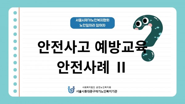 이번 교육을 통해 참여 어르신들의 활동 중 안전의 중요성을 공유하고, 화상, 베임, 자연재해 등 사고 예방을 위한 기본적인 안전 수칙을 함께 살펴보는 시간을 가졌습니다.